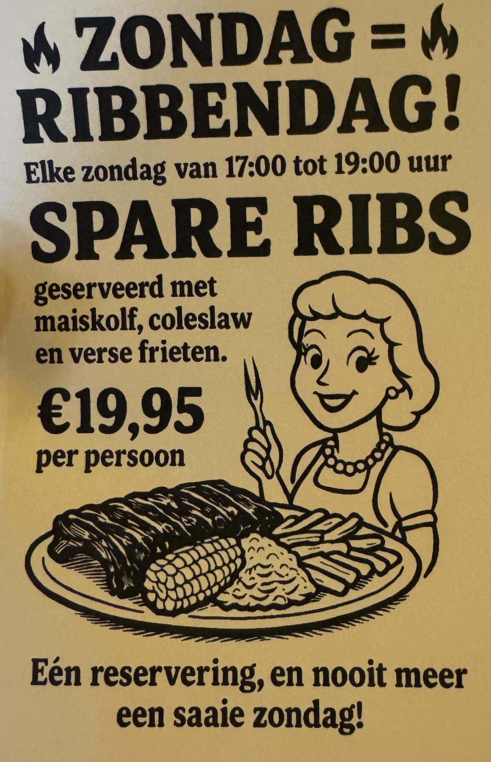 De komende zondagen serveren wij van 17:00 tot 19:00 uur weer onze befaamde spareribs. Geserveerd met een maiskolf, huisgemaakte coleslaw en verse frieten. β¬19,95 per persoon.