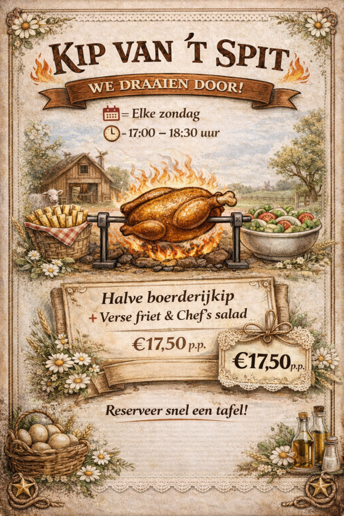 De komende zondagen serveren wij van 17:00 tot 18:30 uur onze befaamde boerderijkip. Geserveerd met verse frietjes, een chef's salad en sausjes. Al dit lekkers voor maar €17,50 per persoon.